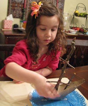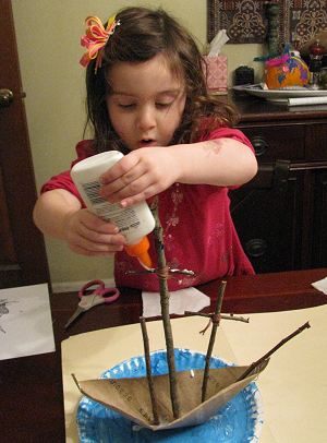 7. Tear strips of tissue paper and glue them to the plate as waves. My toddler son, who had up until this point not shown much interest in the craft, enjoyed tearing the paper and helping his sister add the waves.