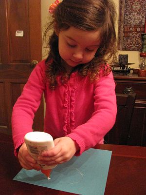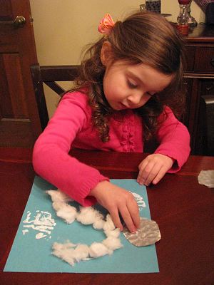 3. Pull apart the cotton balls and glue around the “S”. This tactile fun was my kids’ favorite part. My son asked, “I can touch this?”